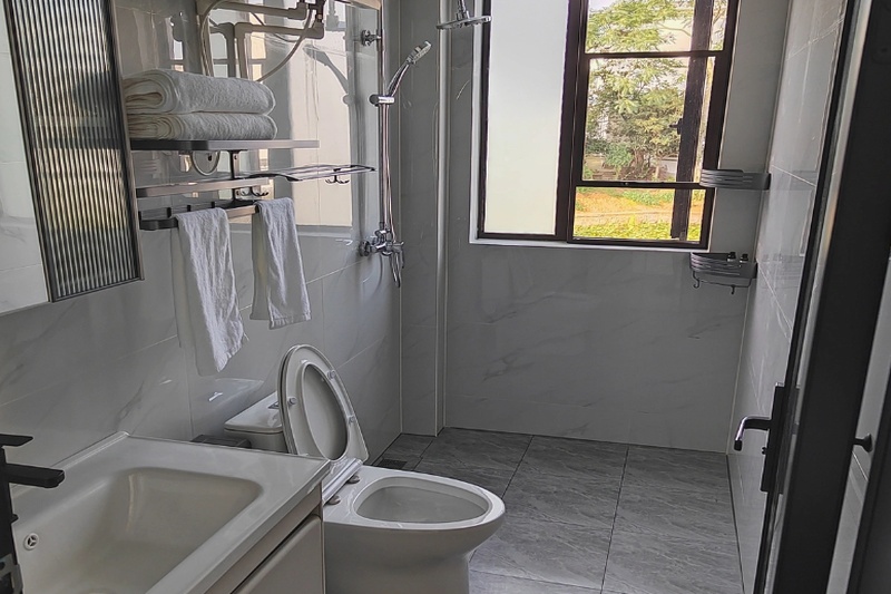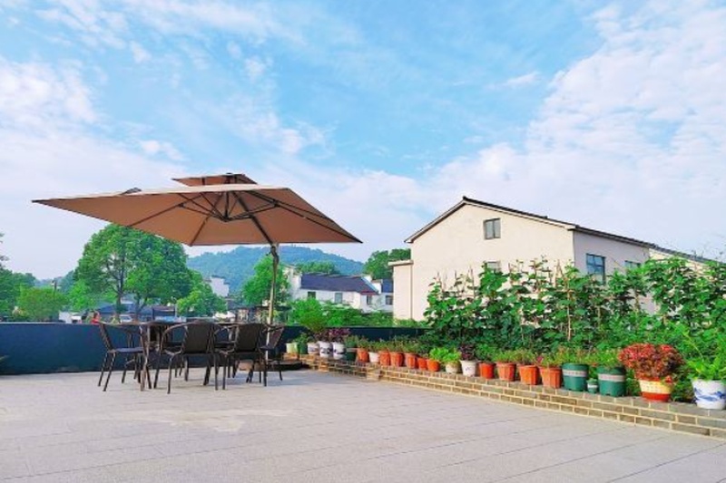 民宿周边环境优美且安静,给人一种远离城市喧嚣的感觉。建筑外观简约,内部空间设计合理,有宽敞的楼梯、干净整洁的卫生间等,部分房间还带有露台,露台上摆放着遮阳伞和桌椅,适合休闲放松。