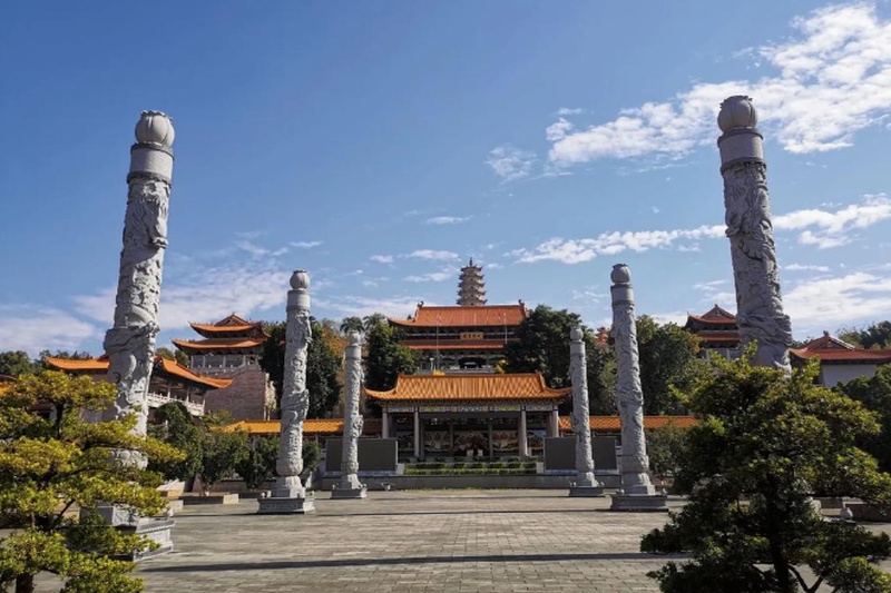 梅州千佛塔位于梅州市东郊大东岩山顶,是为保护南汉千佛铁塔而建的女众道场,也是广东省重点文物保护单位。现塔为九层花岗石塔,高 36 米,内藏南汉七层千佛铁塔,形成塔中有塔的独特景观,兼具历史与艺术价值。