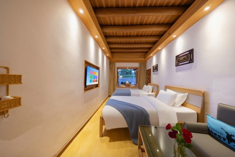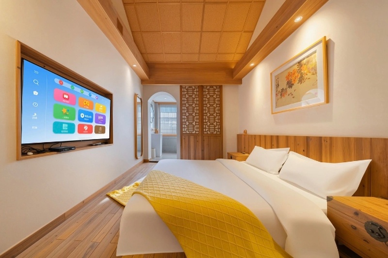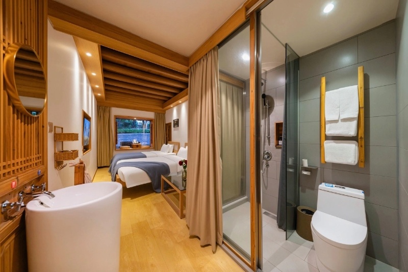 房间内配备有茶具、一次性洗漱用品等,部分房间还设有观景飘窗、自动窗帘、电动坐厕等现代设施,既舒适又便捷。